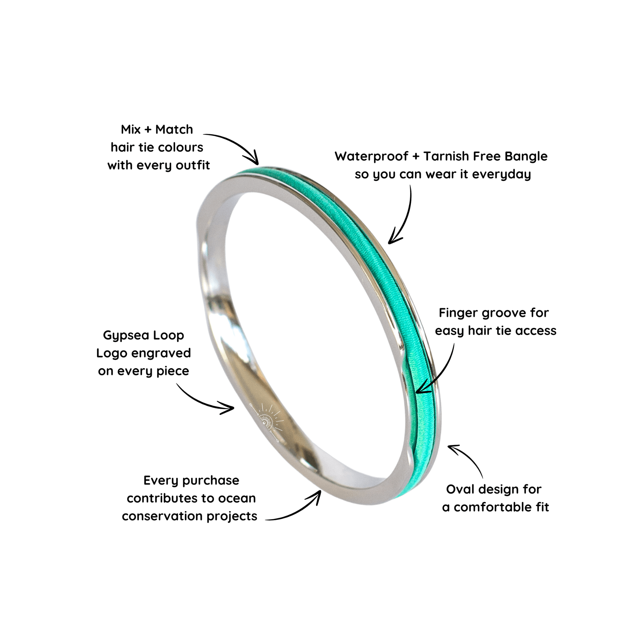 Our Gypsea Loop Bangles are designed with precision and crafted with care. They feature a discreet groove that securely holds your hair tie in place, ensuring it's always within arms reach when you need it.